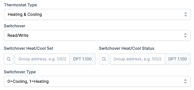 | Switchover Heat/Cool Set | Group address 1-bit (DPT 1.100) - flags: C,W | Group address to perform heat/cool switchover (aka. changeover). |